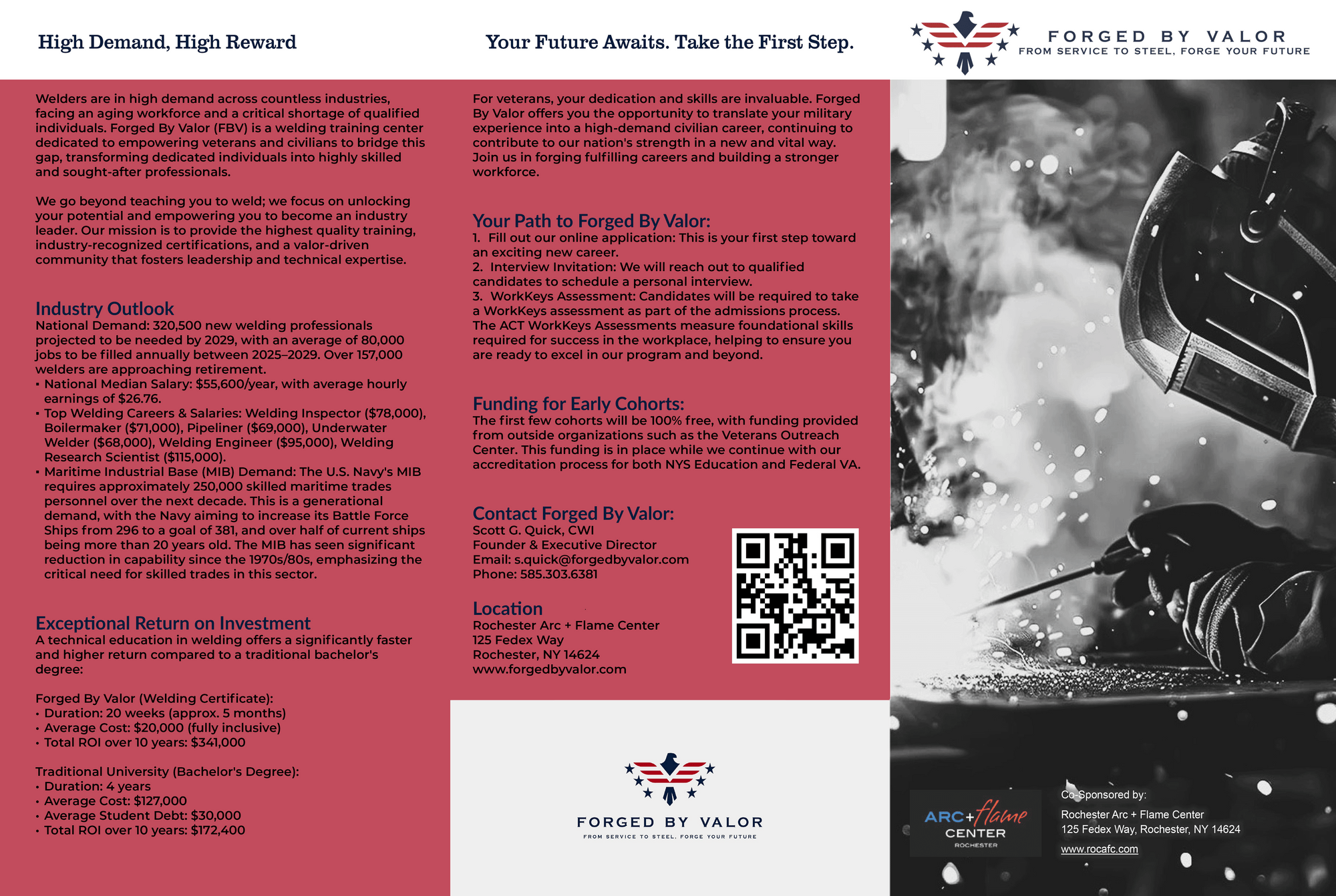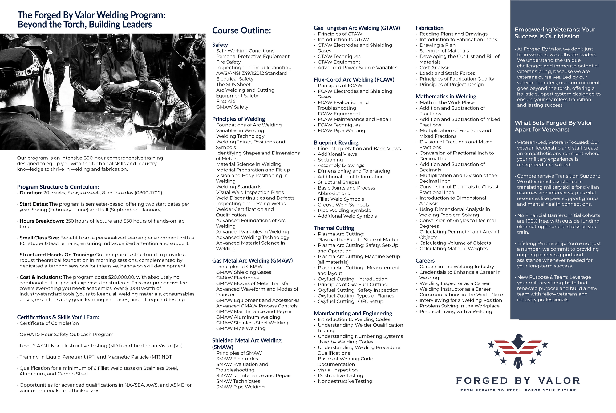 Forged By Valor is a premier career training program dedicated to equipping U.S. military veterans with the high-demand, specialized technical skills necessary for successful post-service careers in welding and skilled trades. We bridge the gap between military service and civilian employment by providing intensive, high-value training. Through a foundational partnership with the **Veterans Outreach Center (VOC)**, Forged By Valor ensures that initial cohorts receive **100% tuition-free training**, allowing veterans to focus on mastering their craft and securing a promising future without financial burden.